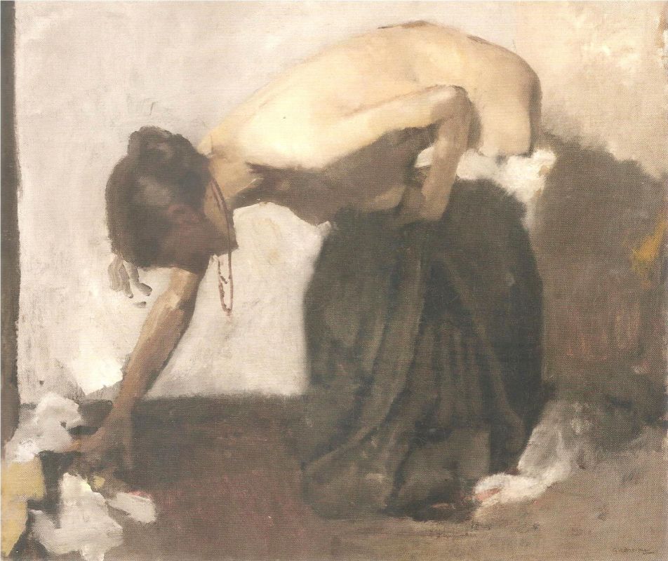 Dat Breitner er ook zat is een verrassing. Vooral als je ziet hoe hij in navolging van Degas baadsters en danseressen neerzet, maar dan ver van etherisch. Keukenmeiden als ballerina. Een onvergetelijk model dat huiselijk haar kleren bijeenraapt. En een - helaas niet opgehangen rij dames die hun hoeden vasthouden in de wind aan boord van een schip. Ver van elegant.