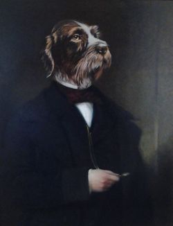 De Brusselse Schilder Thierry Poncelet (1946) is een van de makers van de hondportretten die mensportretten ridiculiseren. Je lacht om mensen, niet om honden.