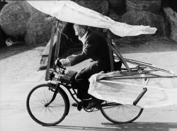Na de oorlog ook op ware grootte. Hij gebruikte daarbij drie paraplu’s. En soms rotors die hij al trappend aandreef, zodat er een soort helikopter ontstond.