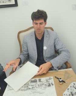 Ik zag hem aan het werk op Amsterdam Drawing, we maakten een praatje. Een wonderbaarlijk hoofd. Hij kiest steden die hij mooi vindt, dat zijn die welke toeristen ook bezoeken. Maar hij neemt ze vaak niet letterlijk, componeert soms een Italiaanse of Nederlandse stad, zoals schilders vaker door de eeuwen deden.