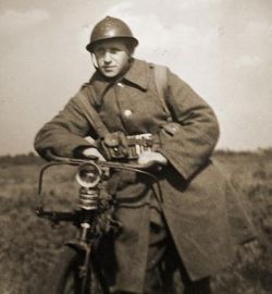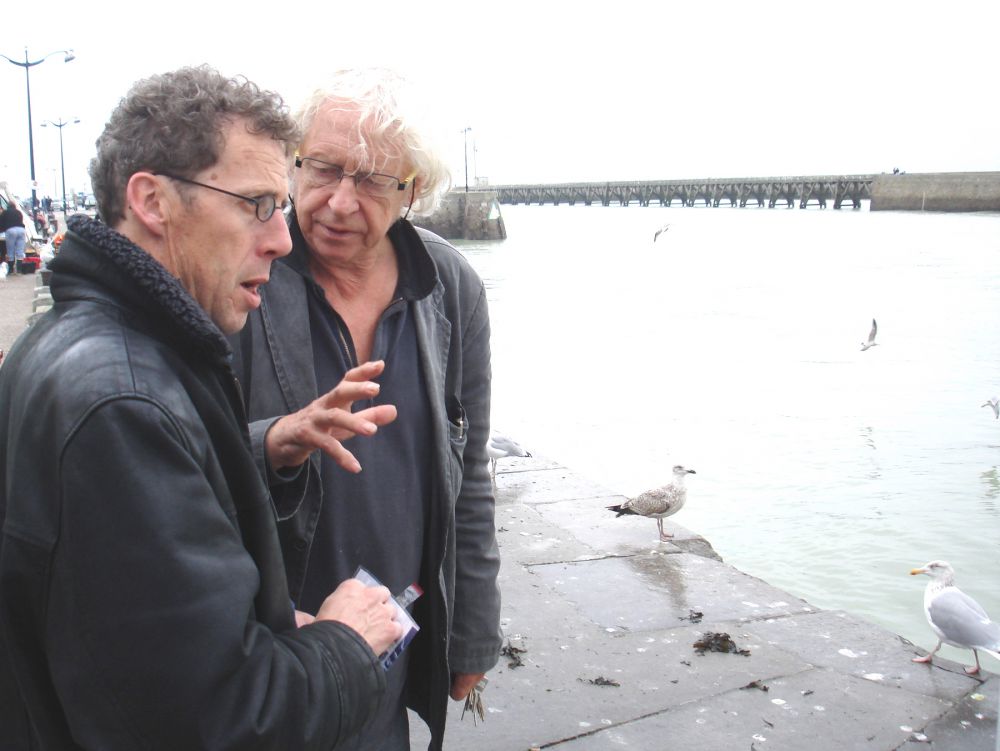 Hij maakt een map open en haalt er zes tekeningen uit waarvan er vooral vier prachtig zijn. Een van de tekeningen die me het minst doet stelt een minuscuul personage voor, helemaal onder op een enorm wit vel geplaatst.