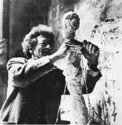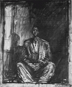 Zo ook bij het portret dat hij schilderde van culturele zwamneus Jean Genet. Wat Genet over zijn sessies bij Giacometti schreef kwam - vertaald door Bernlef - in het tijdschrift Raster, waaruit nu een selectie online staat. Giacometti bekijkt een van zijn beeldjes: