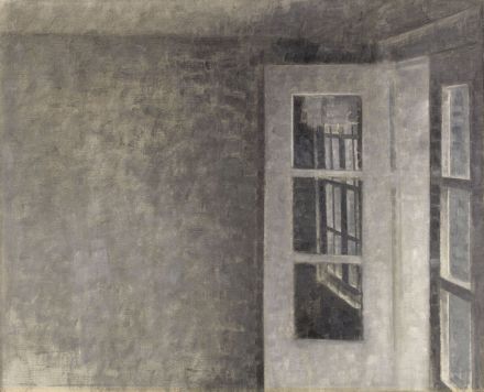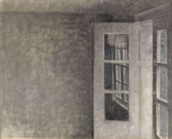 Hammershoi schilderde een huis, ook wit, met een binnenplaats rond vele ramen die uitgeven op andere ramen, je ziet er niets dan huis. Wanneer zoveel niet getoond wordt raakt de toeschouwer bevangen door benauwenis, beklemming.