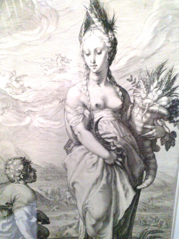 Hier Ceres, godin van de overvloed, ook wel Abundantia genoemd, door Jan Saenredam, vader van, naar Goltzius (1596). Korenaren in d'r haar, hoorn des overvloeds onder de arm, de hand in de schoot waar ze zich met het heft van een sikkel bevredigt. Plotselinge overeenkomsten met de zwoegende, blozende kolchozenvrouwen van het Sovjet realisme. Vader Jan heeft heel wat erotische prenten gemaakt.