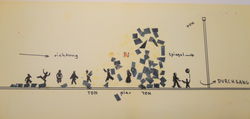 De catalogus vertelt van een gesprek tijdens een autorit in 1959 van Düsseldorf naar Antwerpen tussen Heinz Mack, Otto Piene en Yves Klein (de man van het blauwe monochrome doek).