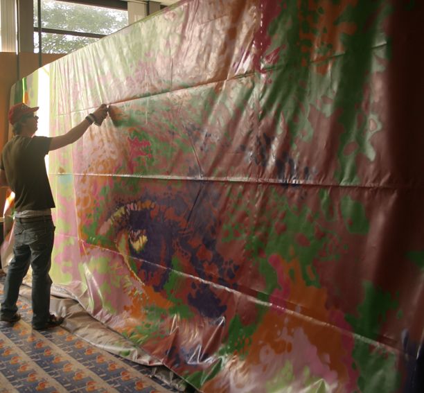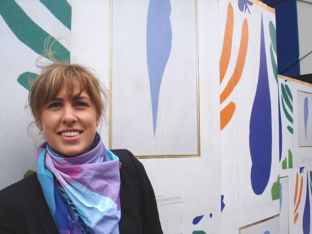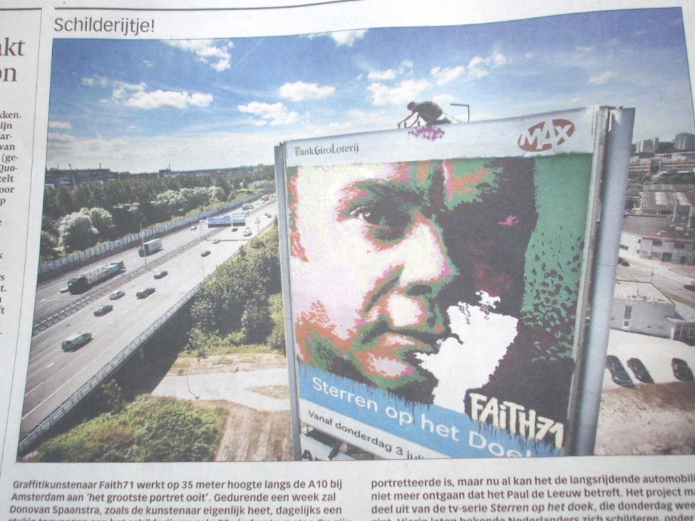 'Hai Wim, vandaag hete zon.. verbrand, hard gewerkt, was zo moe.. had vannacht door voorbereidingen pas om 3 uur mijn bed gevonden en om 6 uur weer opgestaan.. stond samen met een ware Groninger in "de bak".. op 38 mtr hoogte zongen wij liedjes ...hij in Gronings ik in mijn moerstaal Frysk.. Tegen de middag vergezelde ons een fotograaf van de Volkskrant naar ongekende hoogten.. hij had het er zichtbaar moeilijk mee.. ik gaf hem als tip de waarneming te beperken tot de zoeker van zijn imposante Camera.. Hij fotografeerde mij vanuit de hoogwerker terwijl ik op de rand de verf "testte" met links (hoewel ik rechts ben).. maar de rechter klemde ik stevig om de rand!.. had voor het mooie plaatje enkele bussen nonchalant op de rand naast megezet.. ging t waaien.. wiegden die krengen zo'n beetje ENG heen en weer.. Wim ik was zo bang dat wanneer een van die dingen zou vallen ik er intuïtief naar zou grijpen.. mijn evenwicht zou verliezen, over de 45 mtr hoge rand zou tuimelen en.. als een visje aan een haakje middels mijn veiligheidsgordel zou bungelen..! Zei daarom continu "toemaar busje val maar! ik vang je niet hoor.."Spoot voor de vorm wat roze vlekken op het maagdelijk wit naast het logo van de bankgiroloterij.. Enfin het resultaat kun je vandaag als t goed is in De Volkskrant bekijken......Brrrrrr en toch.. was t een kick! wat bezielt me toch Wim.. ik die altijd zo bang ben voor kermisattracties e.d.. ga morgen zelfs abseilen in front of deze megapaul. Is het de hang naar erkenning, is het dwaze hang naar avontuur..?(zie ook dinsdag 26 juni jl.)