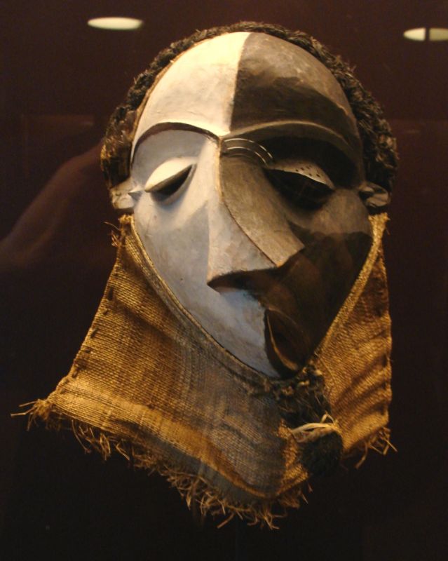 Juist toen de Picasso tentoonstelling in Den Haag werd geopend belandde ik in het vroegere Congo Museum (nu: Midden-Afrika Museum) in Tervuren bij Brussel. Bekeek de oerbronnen van vele streepjespatronen en stond oog in oog met de maskers, de gesneden koppen.Allereerst, wat zijn ze ongelooflijk mooi en krachtig. Levende mensen zowat. Zo getypeerd dat je personen uit je eigen omgeving gaat herkennen. Wat je leert is dat het meestal afbeeldingen van voorouders zijn, de goede en kwade krachten die zo'n gemeenschap beheersten. Wie danste met zo'n masker bracht een voorouder tot leven. Wat ik fotografeerde is een 'ziektemasker' van de Mbangu uit centraal Pende. Het vertrokken gezicht betekent ziekte. Het zwart en wit-contrast geeft verscheurdheid aan, innerlijke strijd. Wit is de kleur van de doodsgeesten, die bezworen moeten worden.Een urgentie die in de esthetiek van Picasso ontbreekt.
