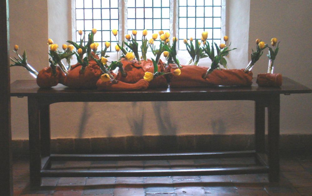 En het geheel is nog thematisch geordend ook. Dus: 'Er is gekeken naar overeenkomsten in thematiek en betekenis bij oude en eigentijdse kunst.' En wat blijkt? 'De raakvlakken bevinden zich op de terreinen van de fascinatie van de kunstenaar, de mentaliteit, het onderwerp en de werkwijze.' Raakvlak, relatie, fascinatie, hoofdpijn.Intussen was het toch nog ergens goed voor. Ik ontdekte bv. de 'Anatomische les' (2006) van Guido Geelen (1961). Een in stukken gebroken gestalte, met in zijn gepottenbakte lijf allemaal glazen vaasjes gestoken, elk met een bloem erin.Bloemen, niet op het graf maar in het dode lichaam.'Gebakken klei, glas, verse bloemen' staat er onder. Gecontroleerd. Ze waren vers.