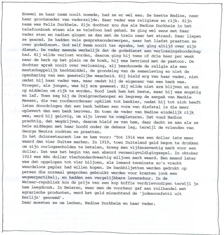 Ik krijg liedjes te horen. Er komt een nieuwe CD na 'Green'. Lamento's zijn het. Klaagliederen, maar nooit zonder ironie. Neem het lied over de aanslag op de man in de electrische rolstoel. Waaruit dit fragment: There's an oak, and a birch, by a gate in the grass,And a spider in it's web, by a farm.By the road with an ant, in the tar and a beek,With cows and machines, lopen langs.Platting grass for a laugh, with sweaty hands from the time,Behind the wheel of a car, in the sun.The lamp is alone, by the road to the farm,And the logs are in piles, next to a hedge.There's a fence made of wire, tied in knots by the gate,And the sun lights my legs, and the field.The cows are lying down, in the shade by the hedge,And the wind is blowing strong, through the trees.There are birds in the sky, and a man in a chair,Rolling along with the power, of electricity.He is handycapped but smiling, disabled but is laughing,He is looking at the plats, in the grass.Two boys on their bikes, drag a ramp made of wood,And prepare it for the man, in his chair...Dan Geesin tekent, maakt films en muziek. Hij is van Engelse komaf maar woont en werkt al elf jaar in Nederland. Hij studeerde aan de Ateliers en spreekt vloeiend Nederlands ('natuurlijk, dat moet, hier wordt gewerkt'). Maandag na 21.00 is hij te horen in De Avonden. Met orgeltje.