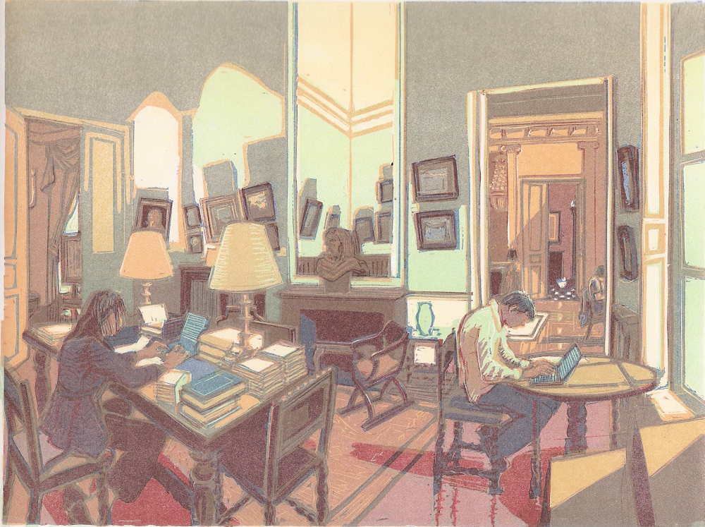 Wat de doeken in de reeks gemeen hebben is het glimmen van de vloeren, steeds in het midden van een al te ruim oppervlak. Leegte die je aan gaat staren..