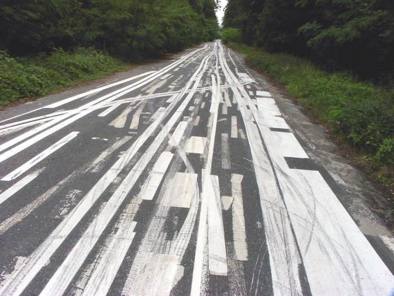 Ja, die strepen. De enorme hoeveelheid witte strepen waarmee het was volgekalkt. Er waren zoveel pijlen bij ook, hele brede witte pijlen, die dwingend wezen 'die kant op'.