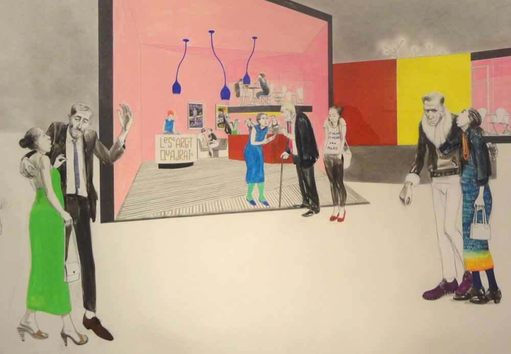 Het verhaal van het fantasie-eiland waar dit alles zou gebeuren is een kapstok. De spanning komt uit Avery's observaties van intellectuelengedrag. Heel mooi in de affiches die hij ophangt en die hij in de tekeningen laat terugkomen. 'What's the matter with idealism', zoals de tentoonstelling heet, is sterk, maar ook Heideggers 'Dasein' doet het goed als affiche.