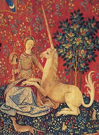 De vijf wandkleden van de Dame en de Eenhoorn in het Musée Cluny in Parijs behandelen elk een zintuig. De tastzin is de mooiste, daarop omvat de jonkvrouw de hoorn van de Eenhoorn.