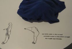 Vanmiddag in het textielmuseum, bij Under the skin zag ik het van alle kanten. Bij Erwin Wurm - bekend van zijn geestige tentoonstelling in het GEM - die je voortekent hoe twee mannen samen een trui kunnen dragen. Of alle manieren om een trui verkeerd aan te trekken: armen, benen, hoofd en dan de vraag welk gat voor welk lichaamsdeel?