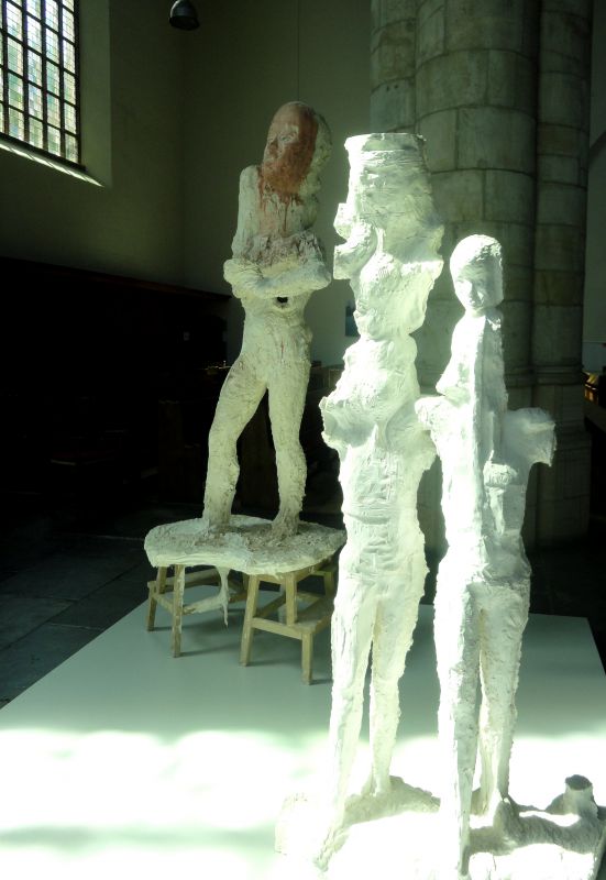Groepen van hem staan in de Kloosterkerk zoals het gezin in 'Triade' (2014). Zo weinig als er nodig is om een naderende of toekijkende figuur op te roepen. Wegwaaiende gezichten en gestalten. Het raadsel dat in elk beeld zit, aanduidingen die je net genoeg in handen geven om nogeens en nogeens te willen kijken.