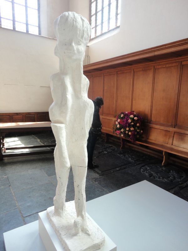 Soms herken je in zo'n gestalte opeens een nuffig koppie boven een sierlijk geheven knie en hoge hak, zoals in de kerk bij - als het zo heet -  'Nicaea' (2015). Giacometti, zijn held, hield vast aan het eens geziene. Of dat bij Tahon zo is weet ik niet.