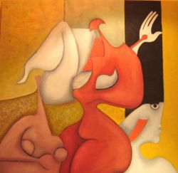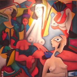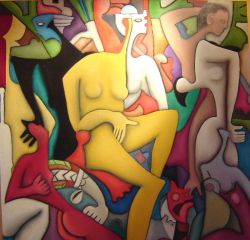 Hoe die heette?Hij wist het niet zeker, maar schreef een naam voor me op een papiertje. Achteraf verkeerd, in elk geval onvindbaar op Google. Macieski is een bestaande Poolse naam, maar een Alexandre of Alexander of Alexandr vind ik niet.Hij woonde in Tournus, een paar straatjes verderop, die polonais. Ik ga terug, ik vind zijn schilderijen steeds mooier.Ze doen me denken aan wat Kuifje-tekenaar Hergé maakte als hij 'moderne kunst' persifleerde. Hergé wilde ooit kunstschilder worden. Dat zag je dan.