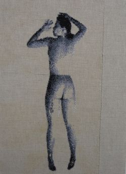 In het werk van Hinke wordt het brave, huiselijke medium borduurwerk toegepast op doorgaans als 'sexy' beschouwde taferelen.