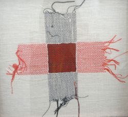 Wat er dan met een toeschouwer als ik gebeurt geeft te denken. Een naakt zelfportret van Hinke wordt in kruissteekjes een vriendelijke huisgenote. De kruissteekjes kleden haar als het ware weer aan. Een geborduurd vrouwengezicht met een kwak zaad erover wordt bijna gezellig.