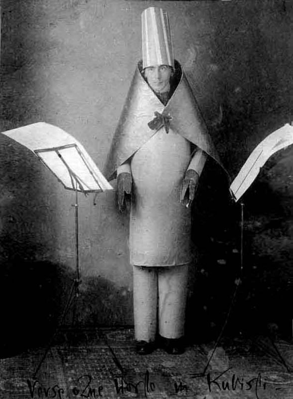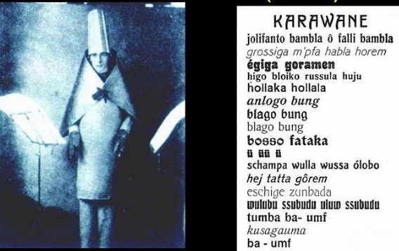 Ball komt met zijn eerste klankgedichten, in het kostuum van de beroemde foto: 'Mijn benen stonden in een pilaar van blauw glanzend karton, die tot mijn heup reikte, zodat ik er tot daar als een obelisk uitzag. Daarop droeg ik een reusachtige, uit gelijmd papier geknipte mantelkraag, die vanbinnen met scharlaken stof en vanbuiten met goud was beplakt en die bij mijn hals zodanig werd bijeengehouden dat ik hem door het optillen en laten zakken van de ellebogen als een vleugel kon bewegen. Daarbij had ik een cilinderachtige, hoge, blauwwitgestreepte sjamanenhoed op.'