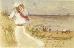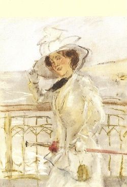 'Tusschen de vierkante meiden met de donkere rokken, die waaiden breed als krinolinen wijd. Vloog licht en rank, in volle zwaai en leliewit de slanke meid. Gloeiend heet en rood in zweet trapte ferm de sterke matroos, meenemend licht, het lichte wicht. In den nevelenden stof, in den wirbelenden dans, in het voeten gebons, in het plompende gestomp, in het vioolgesnerp verdween, kwam op de vliegende meid.' (...) 'En tusschen door de witte hand, verdwijnend hier, verdwijnend daar.'