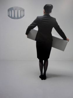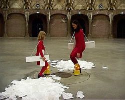 'Easy to love but hard to live with' heet deze omhelzing van een geel ellips, die voorkomt in een filmpje waarin de ellips zich in de omhelzing ook nog opblaast als een ballon.