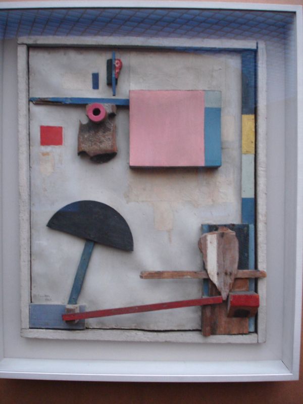 Schwitters (1887-1948) werd beïnvloed door werk van anderen zoals iedereen, maar wat overblijft is toch het eigene. Ook in geschrifte. Maar van zijn denkwereld is in Boijmans amper iets te zien, van zijn klankpoëzie nauwelijks iets te horen. Wat is dat eigene? Liefst zie ik - behalve z'n onnavolgbare gedichten en korte teksten - zijn liefde voor materiaal. Alle soorten, Schwitters was een heel vroege van-straat-opraper. In 1918, de naoorlogse tijd van armoe en 'kolennood' werd weinig weggegooid, toch vond hij gebruikte stukjes ijzer, hout of papier voor collages.