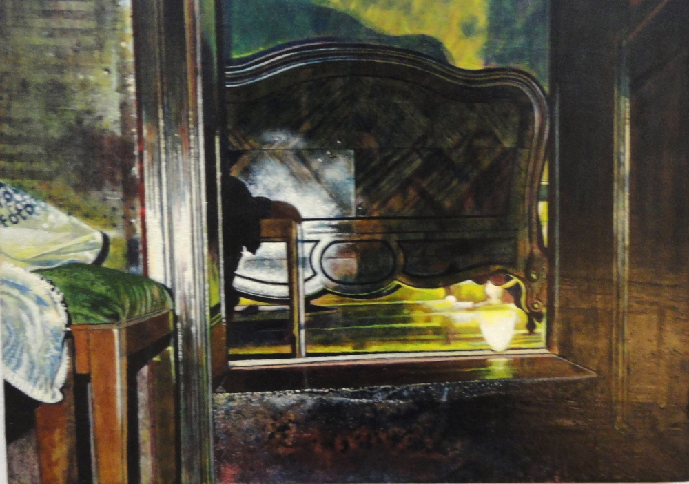 Je kijkt in een spiegelkast die kennelijk aan het voeteneind van een bed staat, maar wat er in of op dat bed gebeurt hult zich in schaduw. Er schijnt licht, maar het sluit je buiten. De deur staat op een kier, zoals veel deuren bij Outjers op een kier staan. Morgen kan ik bellen met verdere vragen.