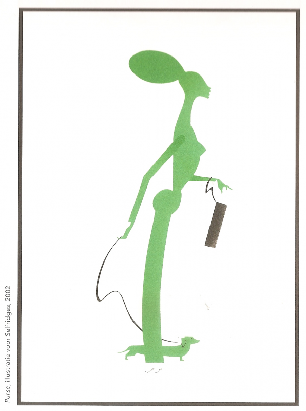 Een mode-illustrator moet een collectie kunnen samenvatten in een icoon dat de klant vanuit de rijdende metro herkent: Prada. Vereenvoudigen dus, weglaten, overdrijven. Hoe breng je vrouwen en kleren terug tot herkenbare signalen? Piet Paris gaat heel ver. Een silhouet en wat accessoires. Plus een grapje, zoals zij hier aan de wand die over straat gaat met een krokodil aan de lijn, omdat haar tas van krokodil is. En je zegt 'ja'.