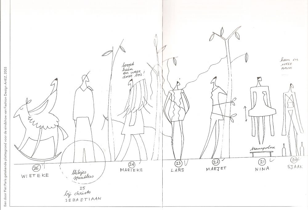 Z'n simpele lijnen dankt hij aan Dick Bruna, zegt hij. Stofuitdrukking, bont en fluweel aan oa. Hans Holbein. Ik zag mijn kans schoon en vroeg hem naar zijn idee van de herkomst van de verveelde gezichtsuitdrukking waarmee modellen vanaf de catwalk op ons neerkijken. Hij denkt even na. Er zit iets in van 'maak het de mannen niet te makkelijk', zegt hij, en die onbereikbaarheid werkt natuurlijk precies omgekeerd.