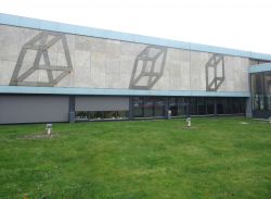 Wat bleef: Sols 'geometrisch relief' aan de gevel dat altijd weer doet opkijken: 'huh?'. Vijf figuren op een rij, oorspronk­elijk bedacht in drie dimensies, twee midden in de vijvers en drie op een breed, rood betegeld pad voor het naastgelegen Museon.