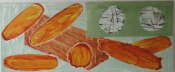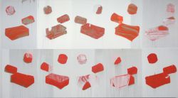 Maar wat er uitvalt blijkt heel uitgekiend. Al zijn het geen herkenbare voorwerpen, ze zijn er wel familie van. Voor het gemak noem ik wat me om de oren vliegt soms maar koffers, of voor mijn part waterijsjes zonder stokje. Al tekenend komt hij altijd weer op niet-bestaande voorwerpen, meerduidig, vreemd. Die kantelen, wankelen, tuimelen en zweven in de ruimte die hij schept.