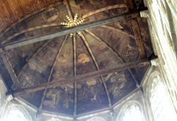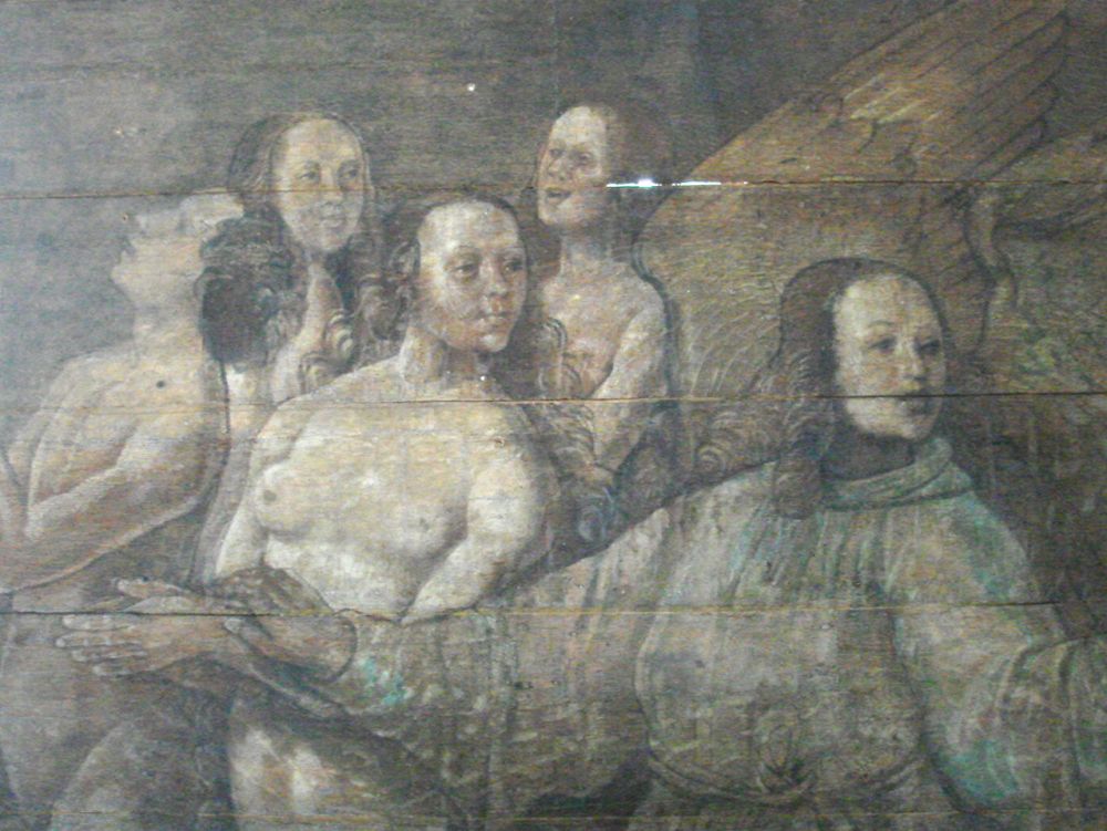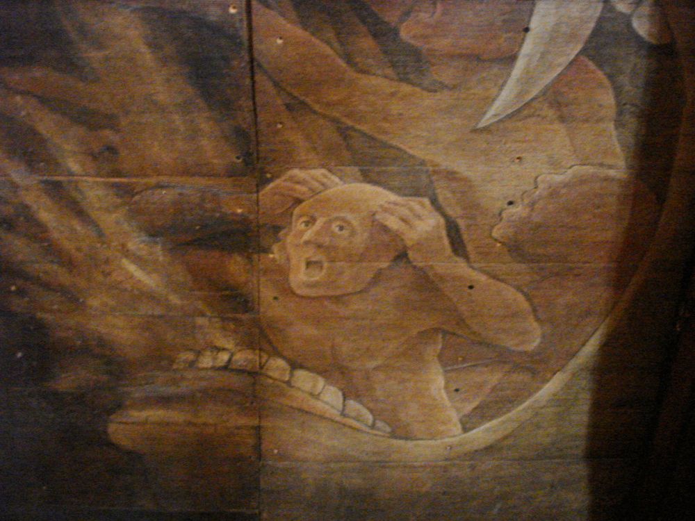 En in het voorbijgaan van de verdoemden en de engelen wees hij me op de bloemdecoraties in de hoeken van het houten gewelf: 'Elk bloemetje, met de hand geschilderd, steeds een ander bloemetje.'