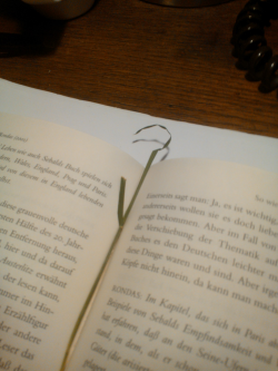 En dan zegt hij dat hij bij zichzelf heeft vastgesteld 'dat we ons steeds op schrikbarend dun ijs bewegen, dat we elk ogenblik weggerukt kunnen worden, dat het geheel van een breekbaarheid is die je bijna niet toelaat van de ene dag naar de andere te komen, en dat je, als je dat onder ogen ziet eigenlijk weet dat je alleen maar stil zou moeten zitten en je niet bewegen, opdat alles als het kan maar langzaam vergaat.'